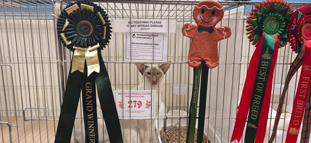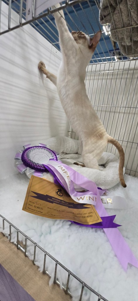 Pixie’s baby Lojada Sir Valentin (also owned by Cheryll) swept the boards at 5 months old across both M&M and National today. A real red card day and more for him as he gained his 2nd and 3rd KC’s, won all his side classes, was Best Section 6 Kitten in both and topping that with a trip up to the posh pens as a Best In Show finalist as Overall Best Section 6 exhibit in National. Thanks to his judges Mrs Di Brown, Mrs S Moore, Mrs J Reed, Mr J Harrison, Mr R Davies.